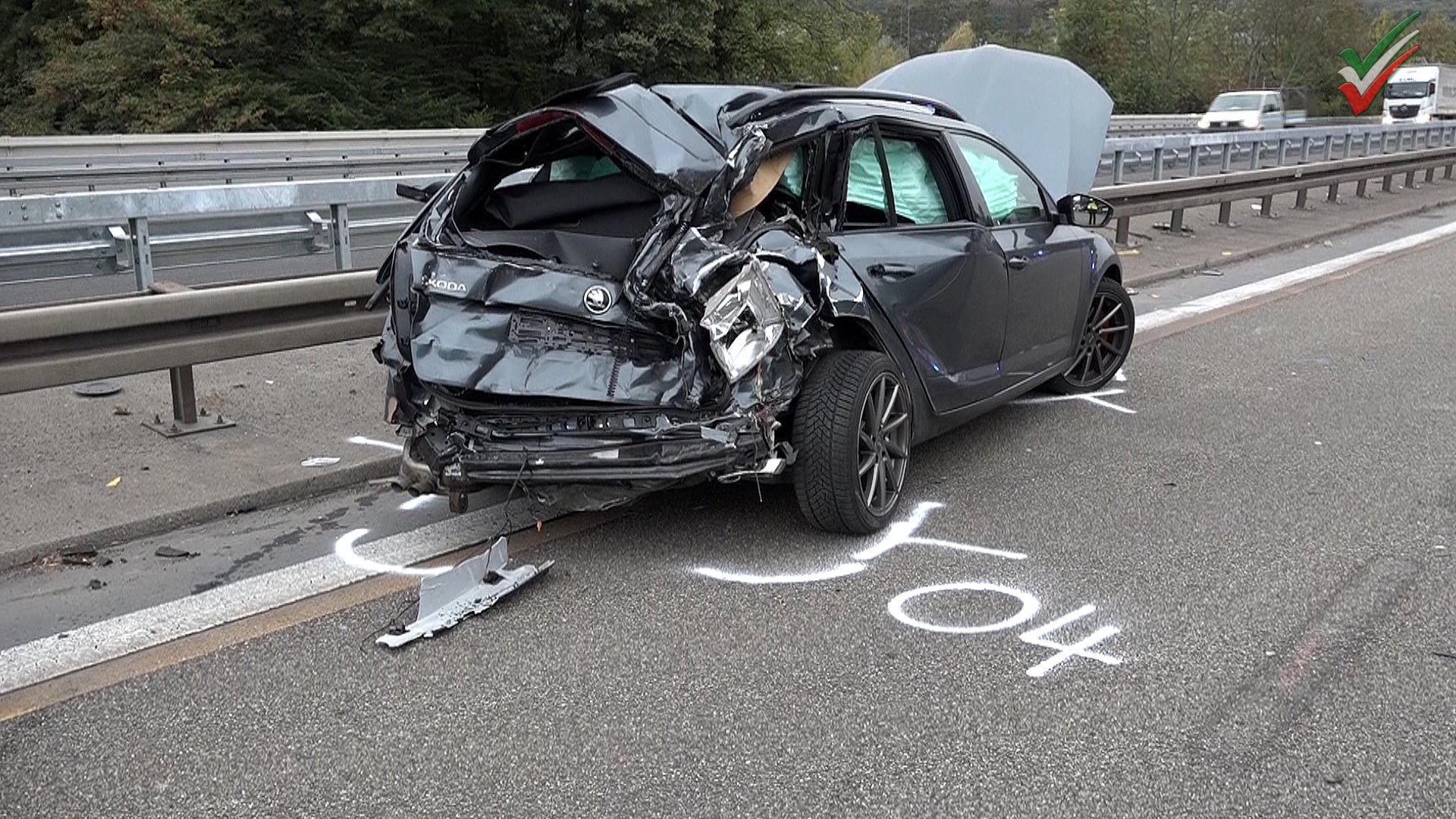 Dortmund (ots)- Zu einem schweren Verkehrunfall kam es heute Nachmittag, 29. Oktober 2018, 15.41 Uhr, auf der A1 in Richtung Köln, zwischen den Anschlussstellen Hagen- Nord und Hagen West. Nach derzeitigem Erkenntnisstand fuhr ein 54-jähriger aus Düsseldorf mit seinem Golf-Variant auf dem mittleren Fahrstreifen der A 1 mit von Zeugen geschätzter sehr hoher Geschwindigkeit. Offenbar unterschätzte er die Geschwindigkeit des vorausfahrenden Pkw und versuchte nach rechts auszuweichen. Dabei streifte der Pkw den Sattelzug eines 46-Jährigen aus Polen, stieß im weiteren Verlauf gegen das Heck eines davor befindlichen Sattelzuges eines 54-Jährigen aus Polen, wurde von dort schleudernd nach links abgewiesen, stieß mit der Fahrerseite gegen das rechte Heck des Pkw eines 49-jährigen Pulheimers in seinem Skoda Octavia und wurde schließlich nach rechts abgewiesen, wo der Pkw dann nach einer Kollision mit der rechten Schutzplanke auf dem rechten Fahrstreifen zum Stillstand kam.